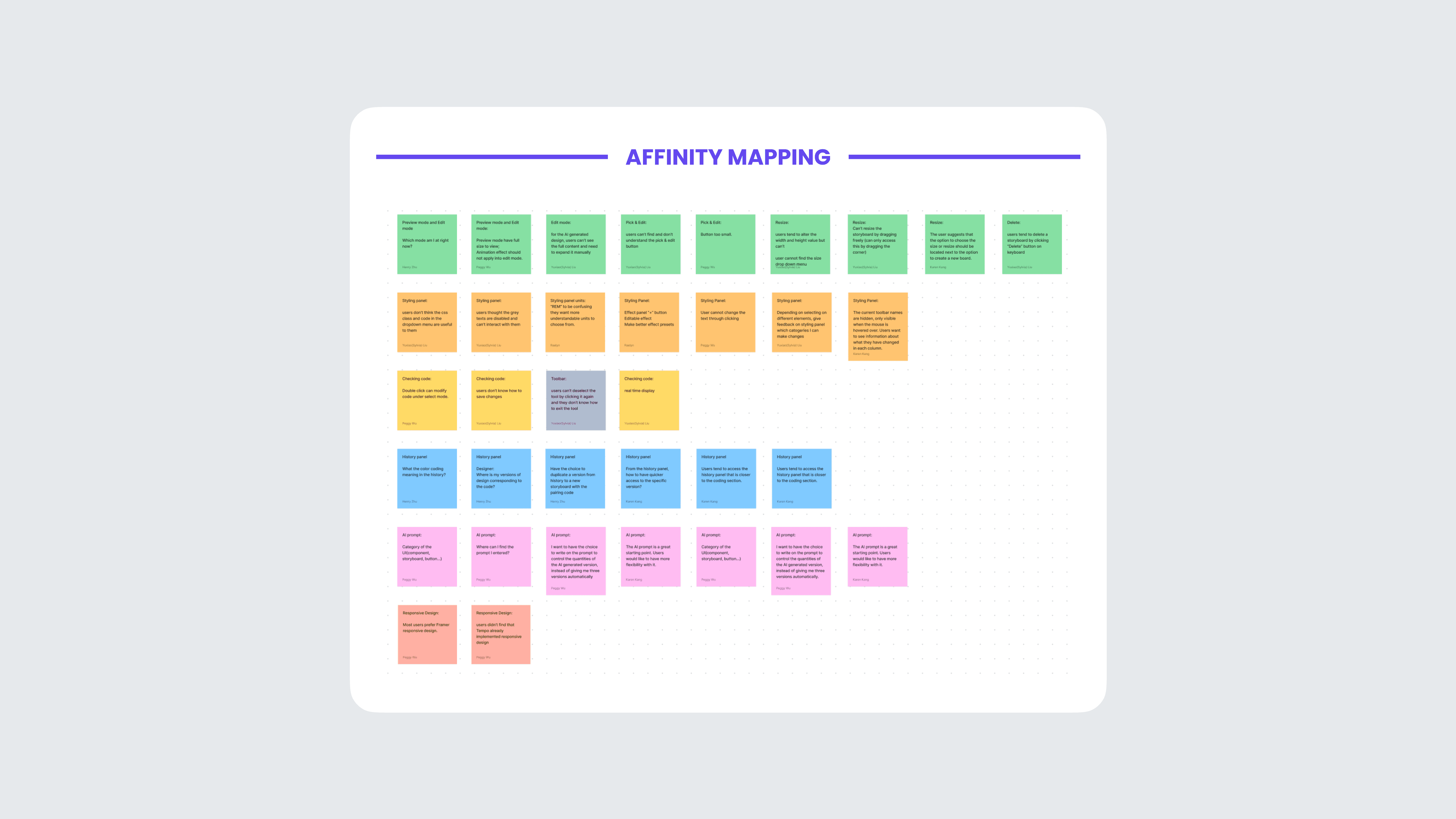 To gain insights, an affinity map was created to organize relevant information from usability testing.