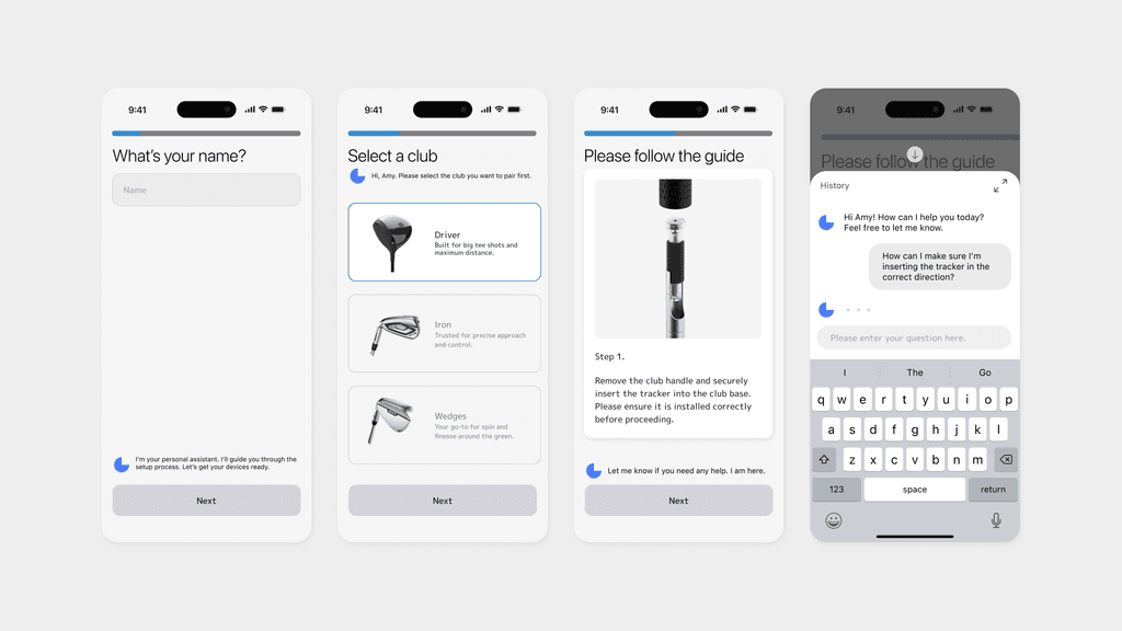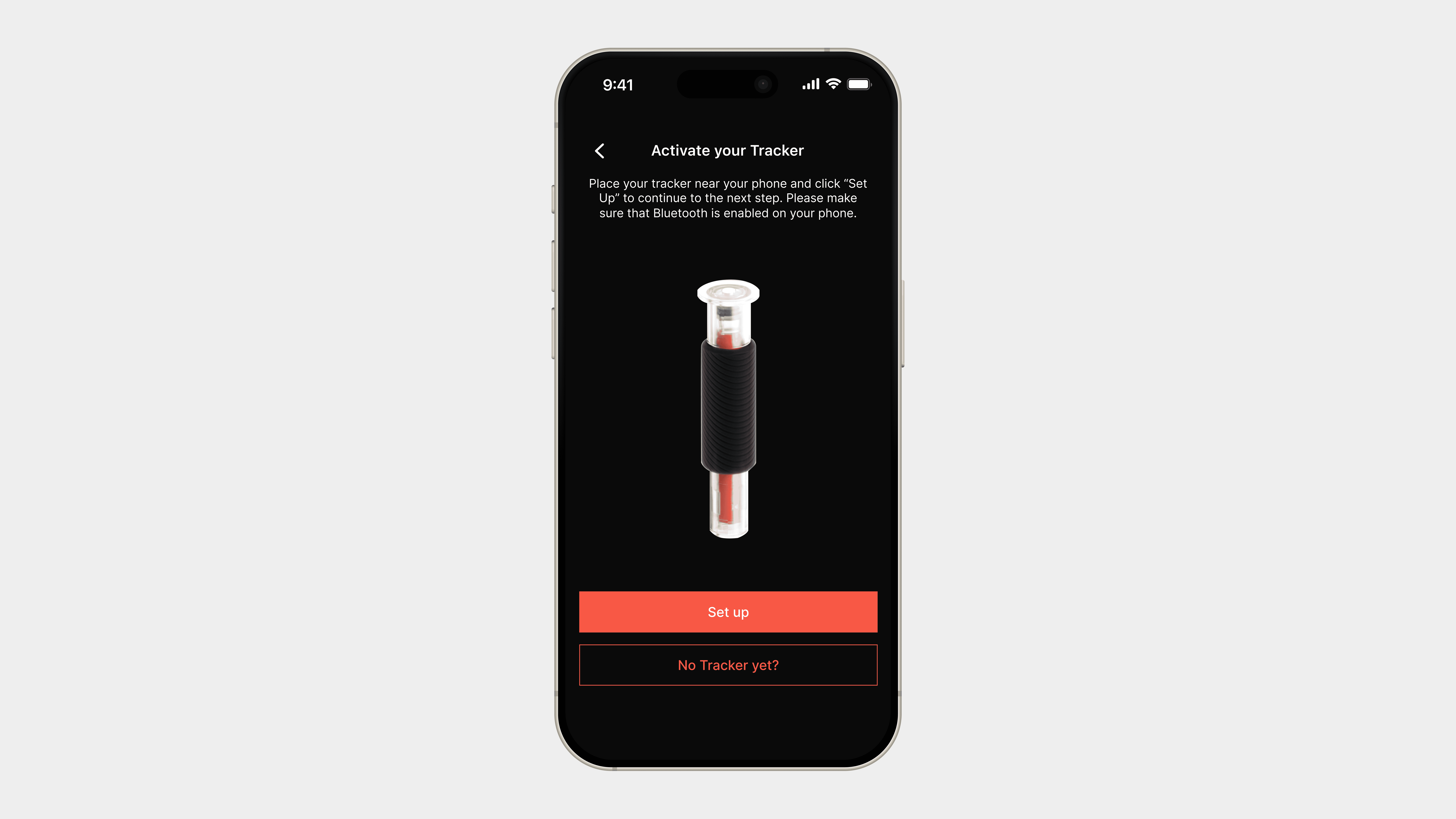Begin the onboarding process by syncing the tracker device with the app to start tracking your golf clubs.
